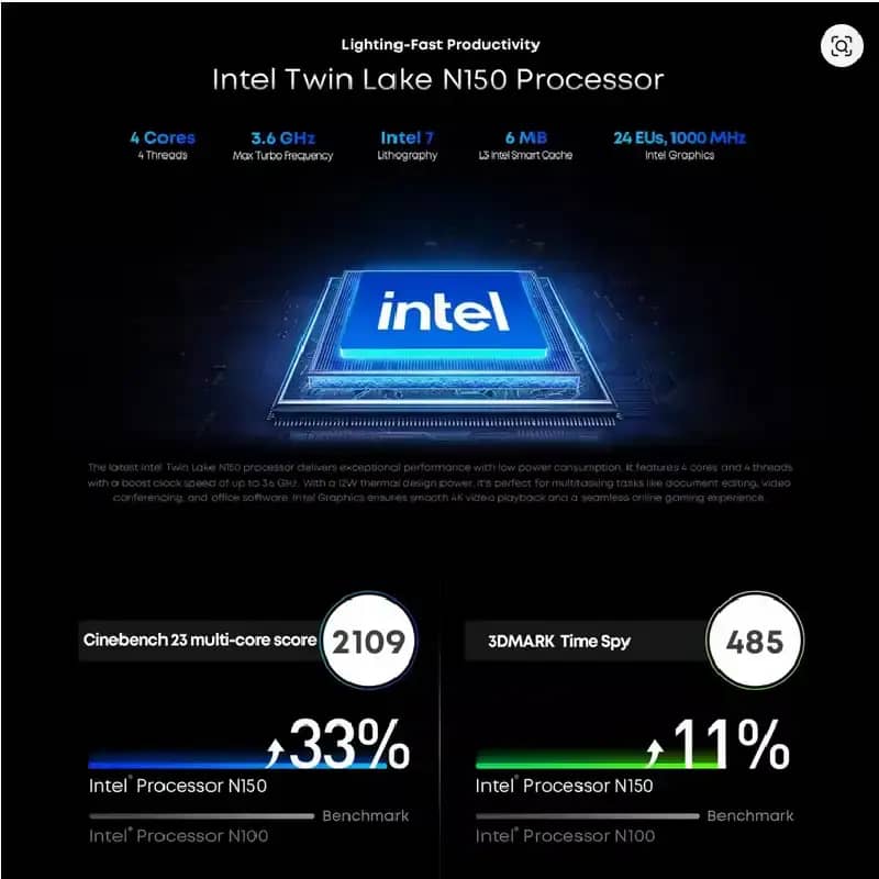 - Prosesor Intel Alder Lake-N150 memastikan multitasking yang lancar dengan konsumsi daya rendah.