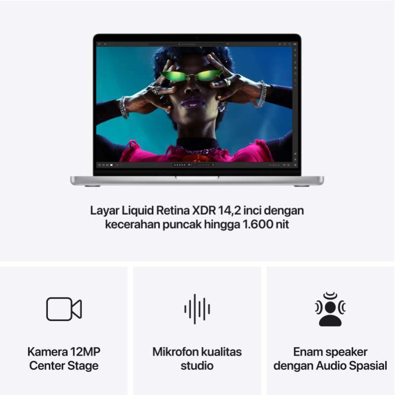 - Layar Pro Cemerlang: Layar Liquid Retina XDR 14,2 inci memberikan kecerahan puncak hingga 1.600 nit, menampilkan visual menakjubkan.