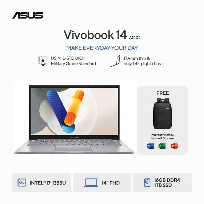 ASUS Vivobook 14 A1404VA dengan Intel Core i7, RAM 16GB, SSD 1TB, dan Grafis Intel Iris Xe. Ideal untuk Pelajar dan Profesional Muda yang Aktif
