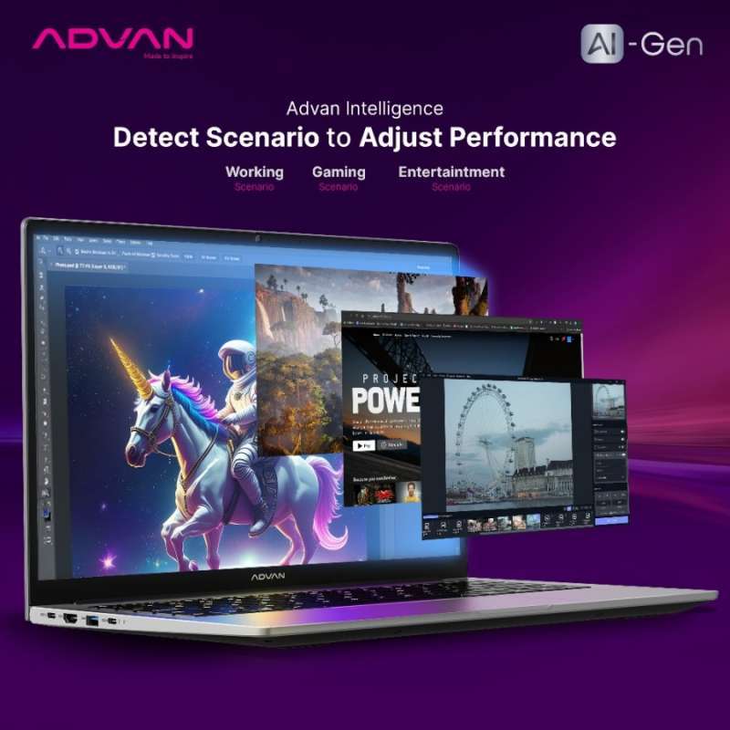 Temukan kenyamanan dan kekuatan dari Advan Laptop AI Gen, didesain untuk mendukung kebutuhan profesional Anda. Ditenagai oleh prosesor AMD Ryzen 7 8845HS, laptop ini menawarkan kinerja luar biasa dengan dukungan AI untuk membantu tugas-tugas sehari-hari seperti pemrograman, pembuatan konten, IT, desain, dan gaming.