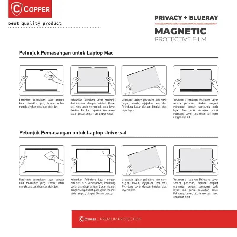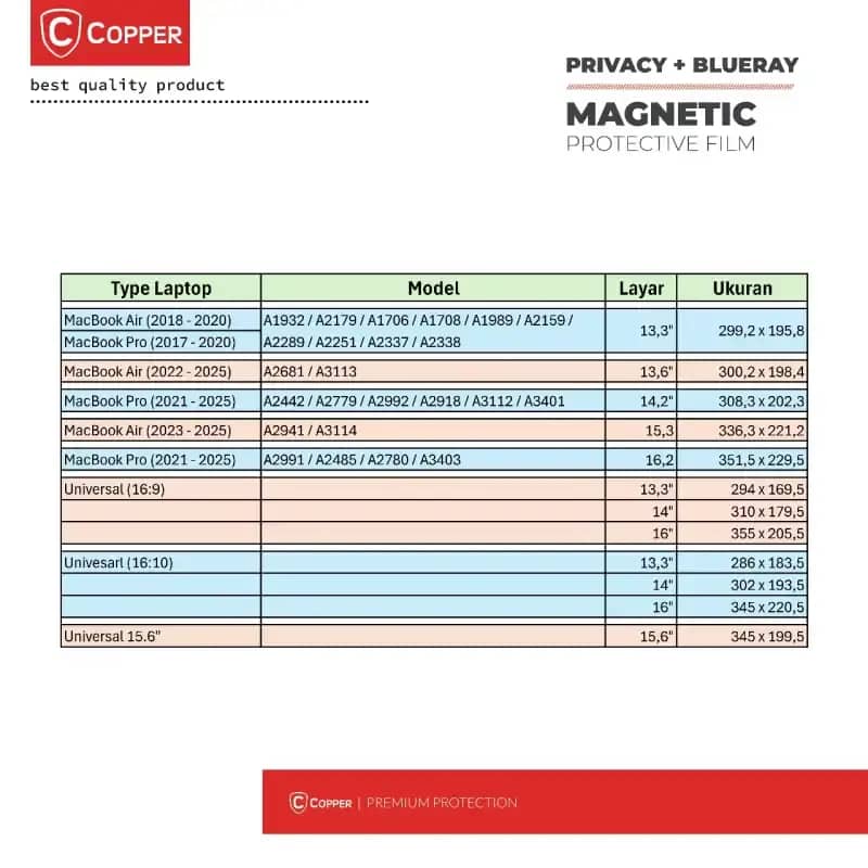 Dengan COPPER Filter ini, Anda tidak hanya melindungi data sensitif, tetapi juga meningkatkan kenyamanan visual Anda. Ideal untuk produktivitas di perjalanan atau bersantai di kedai kopi, pilih perlindungan layar yang dapat diandalkan setiap saat. Untuk ukuran produk dan kompabilitas, silakan lihat gambar produk nomor 6.