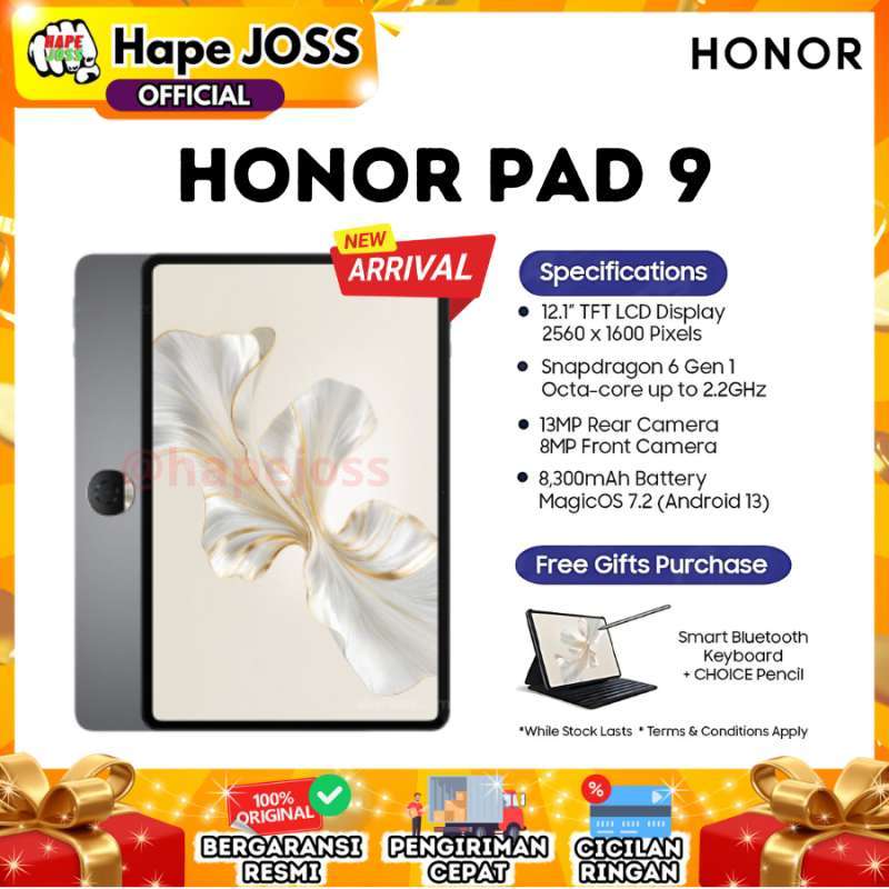 Pembelian Honor Pad 9 WiFi memberi Anda bonus keyboard dan pencil gratis, memaksimalkan produktivitas Anda. Pengiriman cepat dan aman di seluruh Indonesia, dengan garansi resmi Indonesia. Rasakan kenyamanan dan kecepatan pelayanan hanya di Hape JOSS Official, tempat Anda mendapatkan hadiah menarik dan cashback!
