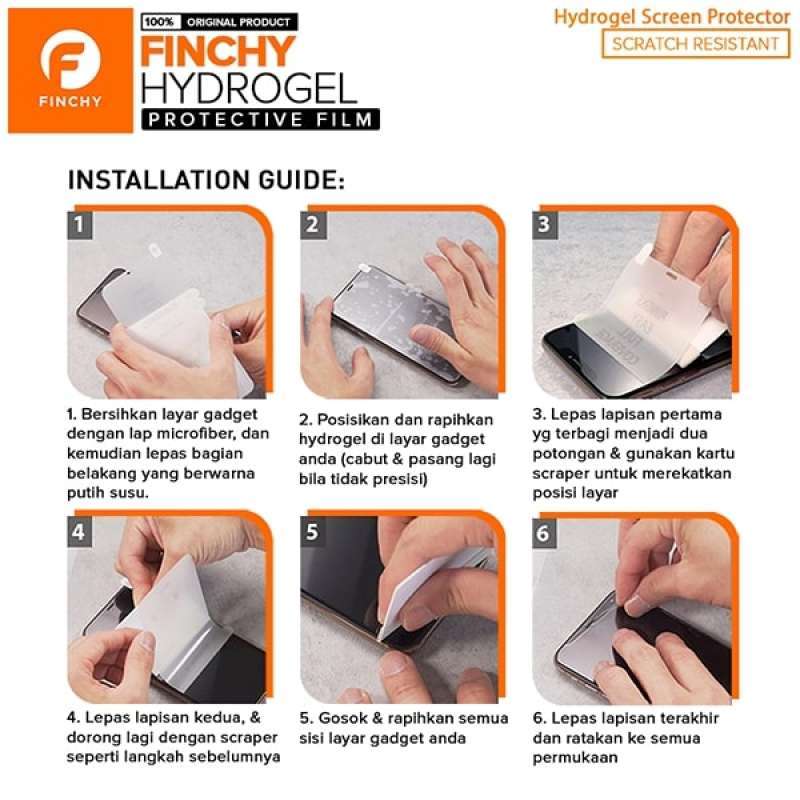 | Kelengkapan Paket | 1x FINCHY Hydrogel 1x Tissue Wipes 1x Sticker Dust-Absorber 1x Microfiber Cloth 1x Swipe Card (Alat Bantu Pasang Hydrogel) |
